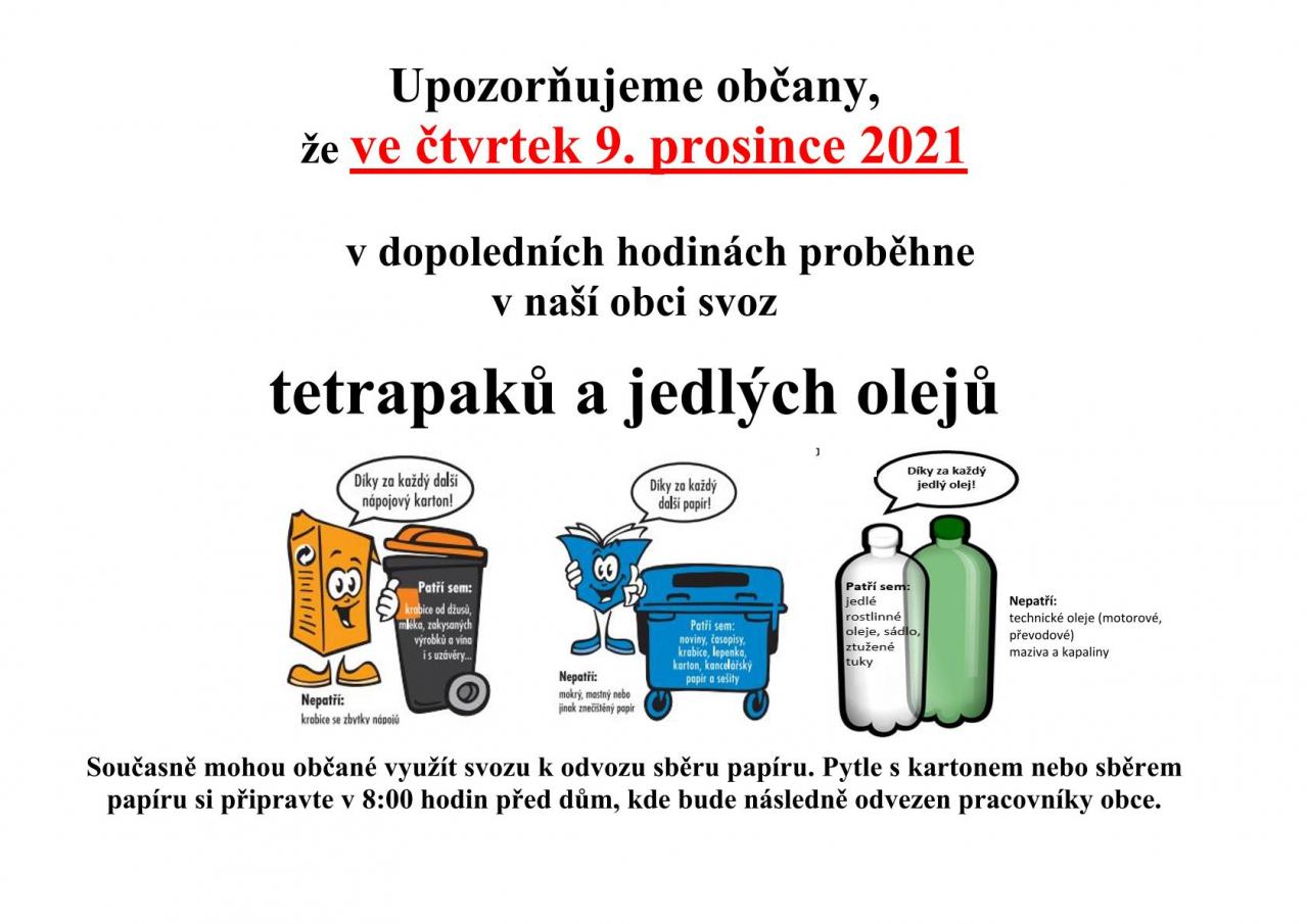 Upozorňujeme občany, že ve čtvrtek 9. prosince 2021 v dopoledních hodinách proběhne v naší obci svoz tetrapaků a jedlých olejů. Současně mohou občané využít svozu k odvozu sběru papíru. Pytle s kartonem nebo sběrem papíru si připravte v 8:00 hodin před dům, kde bude následně odvezen pracovníky obce.
